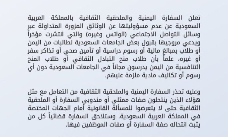 SMA NEWS – RIYADH The Yemeni Embassy and Cultural Mission in Saudi Arabia issued a warning announcement to its nationals…