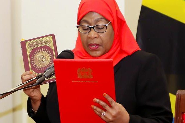 Wearing a red hijab, she took her oath of office on the Koran in a ceremony at State House in the commercial capital Dar es Salaam. She is the first female head of state in the country of 58 million.