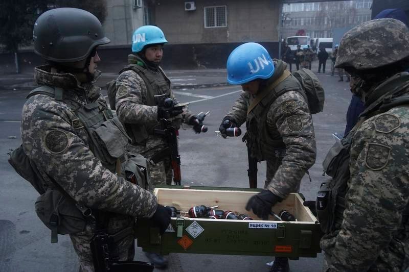 Over the weekend, journalists posted photos on social media showing troops on Kazakhstan’s streets wearing UN blue helmets – which are only allowed to be worn by peacekeepers operating under a UN Security Council mandate.