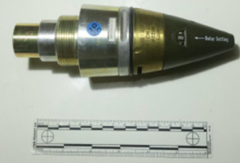 Picture displays an individual proximity fuse against a white surface.