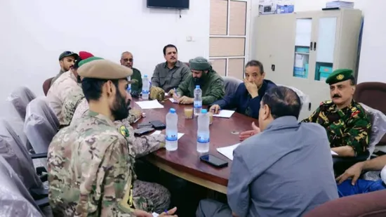 Major General Mutahhar Al-Shoaibi, Director of the Capital Aden Police, met on Tuesday, with the Security Committee and a number of military leaders, in the Security Department in Khormaksar District, in the presence of Major General Fadl Hassan Al-Omari, Commander of the Fourth Military Region, Major General Ali Al-Bishi, Commander of the Southern Land Forces, and Major General Ali Al-Awlaqi, Chairman of the Security Committee.