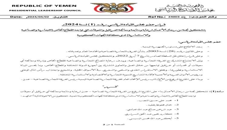 Member of the Presidential Leadership Council, Abu Zaraa Al-Muharrami, issued Resolution No. (1) of 2024 regarding the formation of a committee of businessmen to sponsor, follow up and address the obstacles and impediments facing the private sector (industrial, commercial and investment) in all relevant government agencies.
