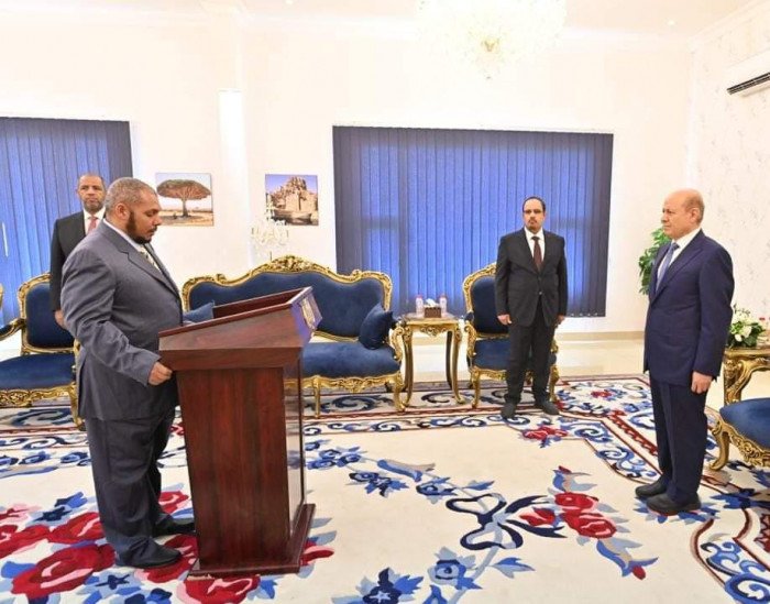 Mabkhout bin Mubarak bin Madi was sworn in on Monday, before Dr. Rashad Mohammed Al-Alimi, the Chairman of the Presidential Leadership Council, after he was assigned the post of Governor of Hadramout.