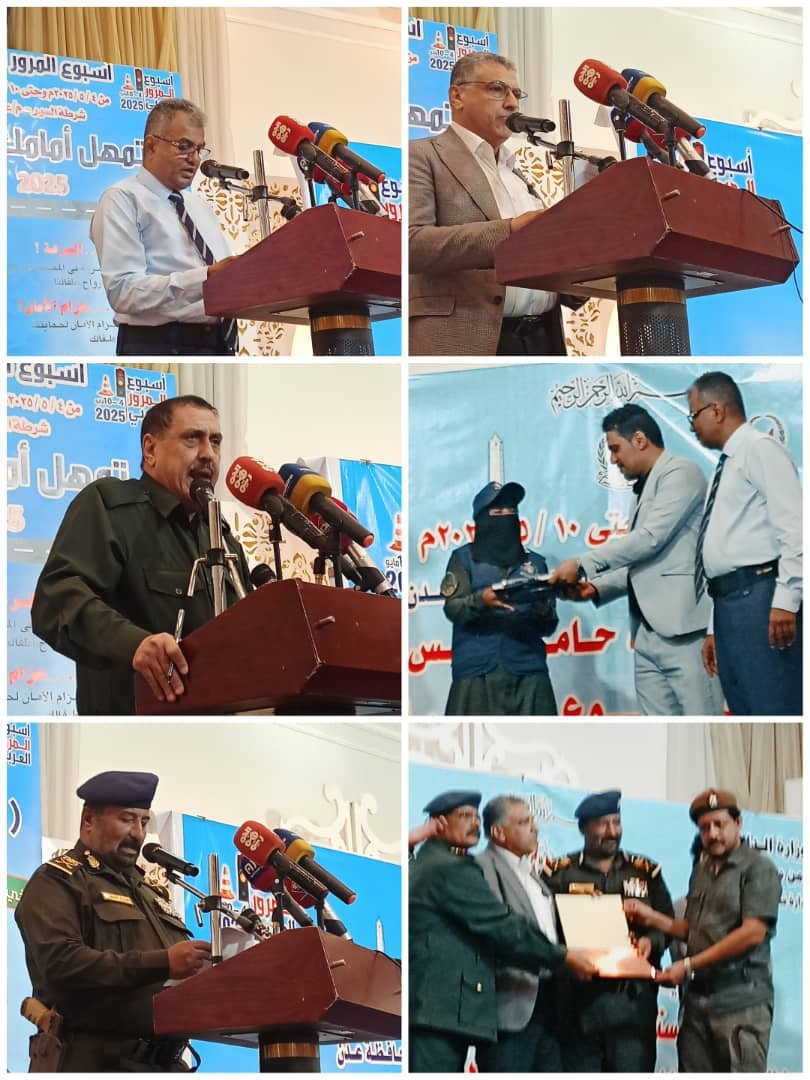 Under the patronage of the Minister of State and Governor of Aden, Mr. Ahmed Hamed Lamlas, the Traffic Police in Aden organized a speech and honoring ceremony to mark the conclusion of the 2025 Arab Traffic Week. The event was held under the slogan: