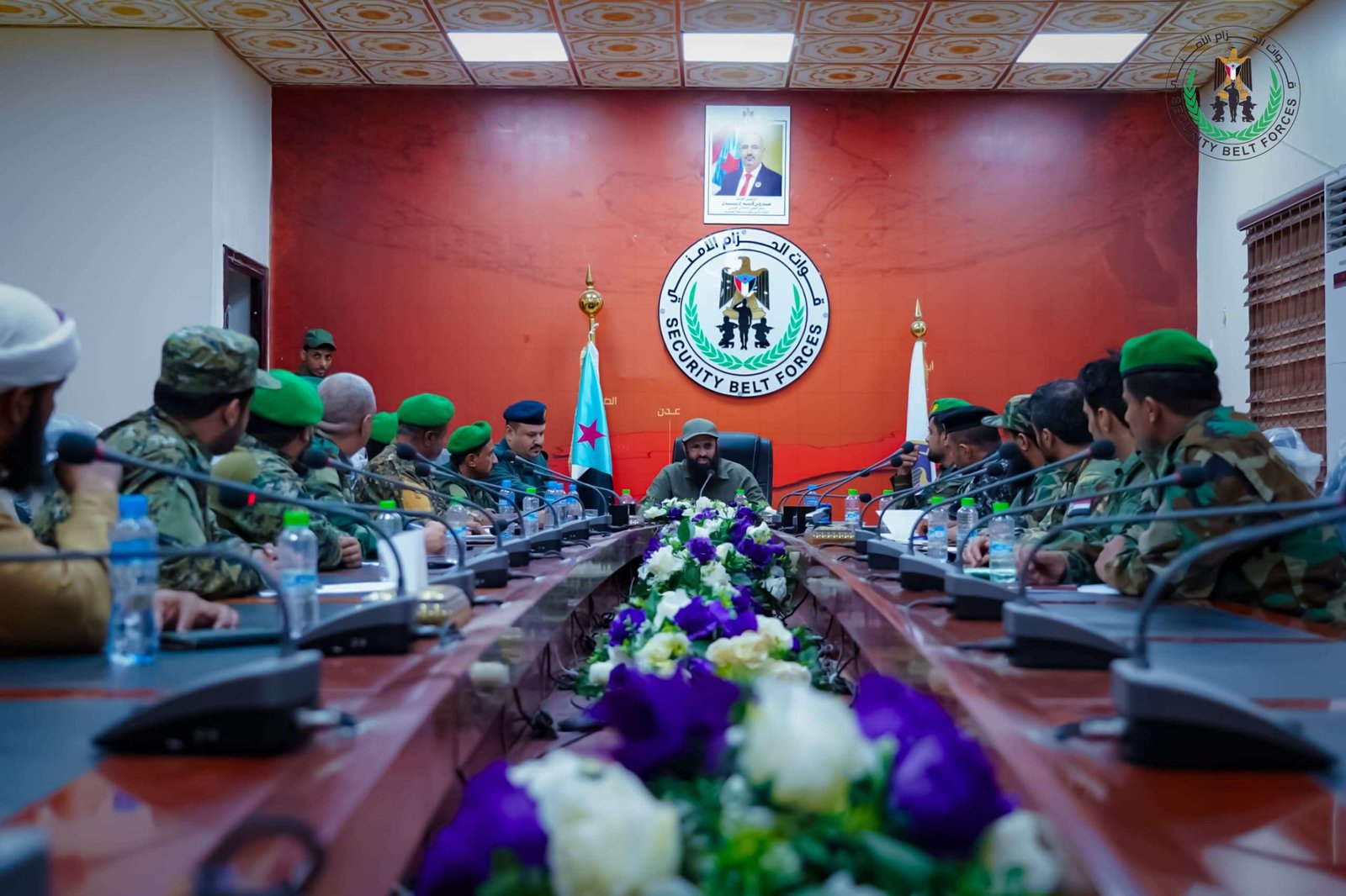 Brigadier General Mohsen Al-Wali, Commander-in-Chief of the Security Belt Forces, chaired an expanded meeting this morning with the leadership of the General Department of Human Resources and department directors in the Security Belts. The meeting was held at the General Command headquarters in Al-Shaab Camp, in the presence of Brigadier General Adel Al-Sanbi, Director of the General Department.