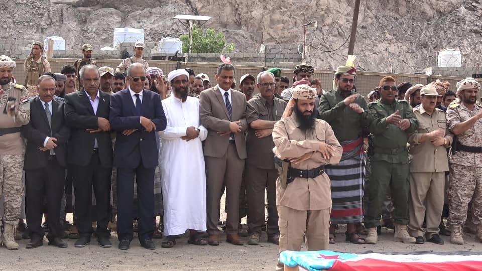 The Governor of the Capital Aden, the Secretary General of Southern Transitional Council Mr. Ahmed Hamid Lamlas, participated in the funeral of the martyrs Awad Al-Saadi, Commander of Support and Backup Operations, and Commander Abdul Majeed bin Shuja, Commander of the Protection Brigade of the First Brigade, Support and Backup, and their companions.