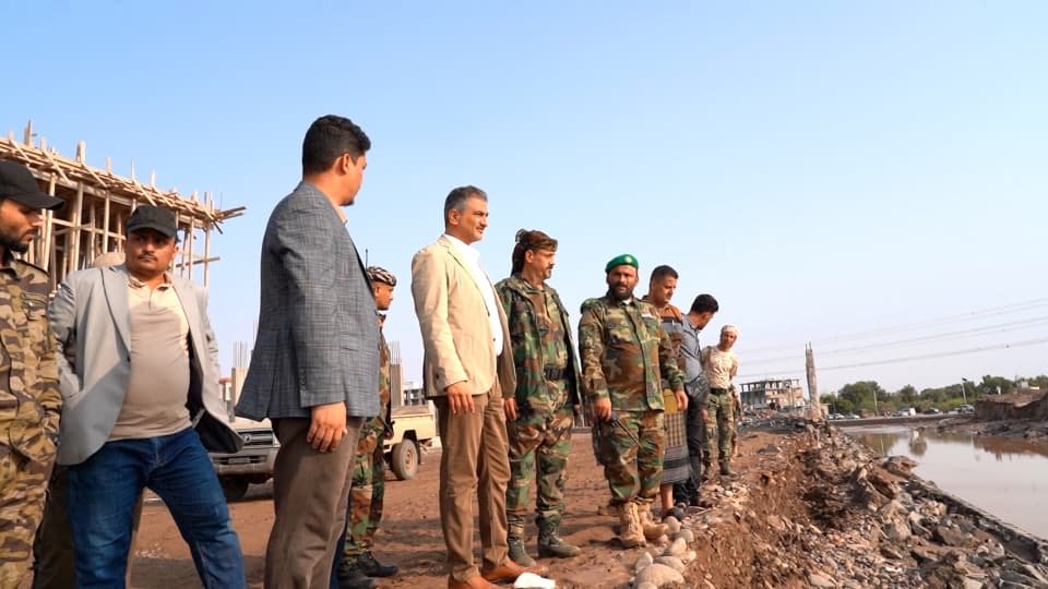 The Minister of State and Governor of the capital, Aden, Ahmed Hamed Lamlas, accompanied by the Director-General of Al-Buraiqah District, Dr. Salah Al-Shoubji, checked on a number of families and areas affected by floods caused by the low-pressure system that hit the city over the past few hours.