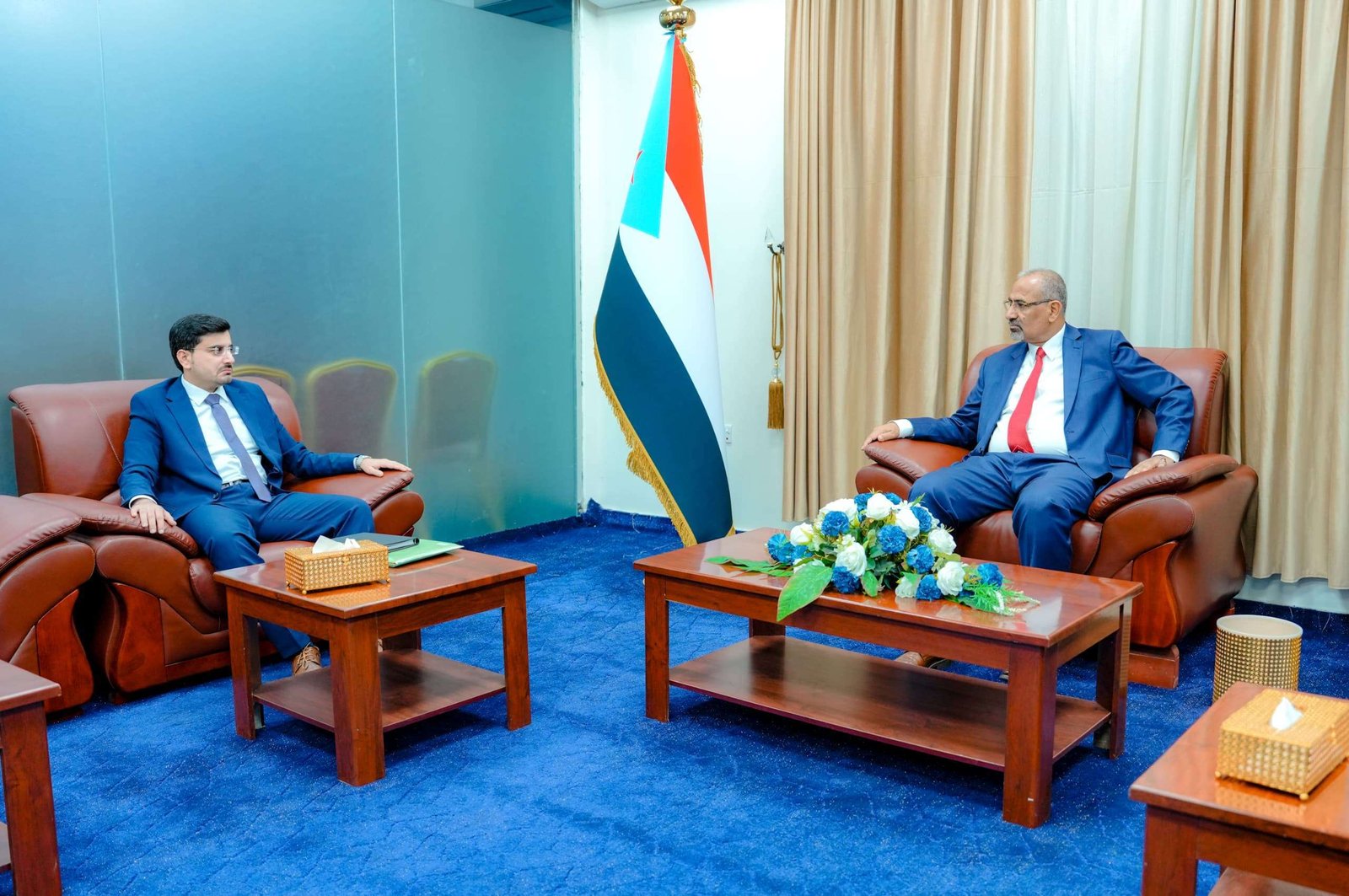 President Aidarous Qassem Al-Zubaidi, President of the Southern Transitional Council (STC) and Vice Chairman of the Presidential Leadership Council (PLC), met on Sunday with Mr. Mujahid Bin Afrar, head of the Local Leadership Executive Body (LLEB) of the STC in Almahra Governorate.