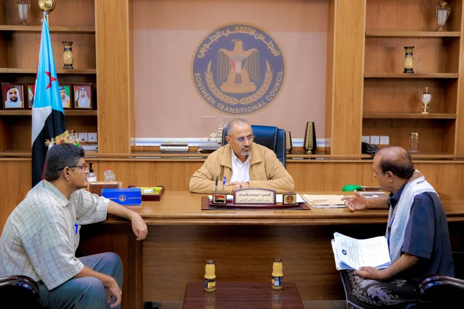 The President of the Southern Transitional Council, President Aidarous Qassem Al-Zubaidi, met on Wednesday, in his office in the capital, Aden, with the head of Abyan University coordinating, Dr. Yeslam Bellayl, and the head of the Students Affairs Department at Abyan University coordinator, Dr. Saleh al-Awlaki.
