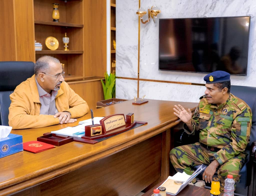 The President of the Southern Transitional Council, President Aidarous Qassem Al-Zubaidi, met on Tuesday, in the capital, Aden, the head of the executive body of the local leadership of the Transitional Council in Hadramout Governorate, Colonel Saeed Ahmed Al-Mohammadi.