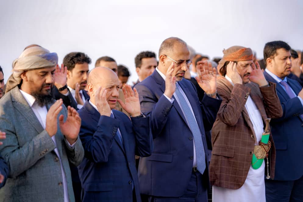 The President of the Southern Transitional Council (STC), Deputy chairman of the Presidential Leadership Council, President Aidarous Qassem Al-Zubaidi, on Monday morning, in the presidential area of Ma’asheeq in the capital, Aden, performed Eid Al-Fitr Prayer along with the chairman and the other fellows of the Presidential Leadership Council, the prime minister of the power-sharing government, Speaker of the Parliament, Chairman of the Shura Council, a number of ministers, governors of givernorates and military, and security officers.