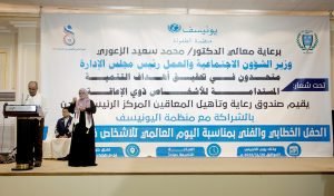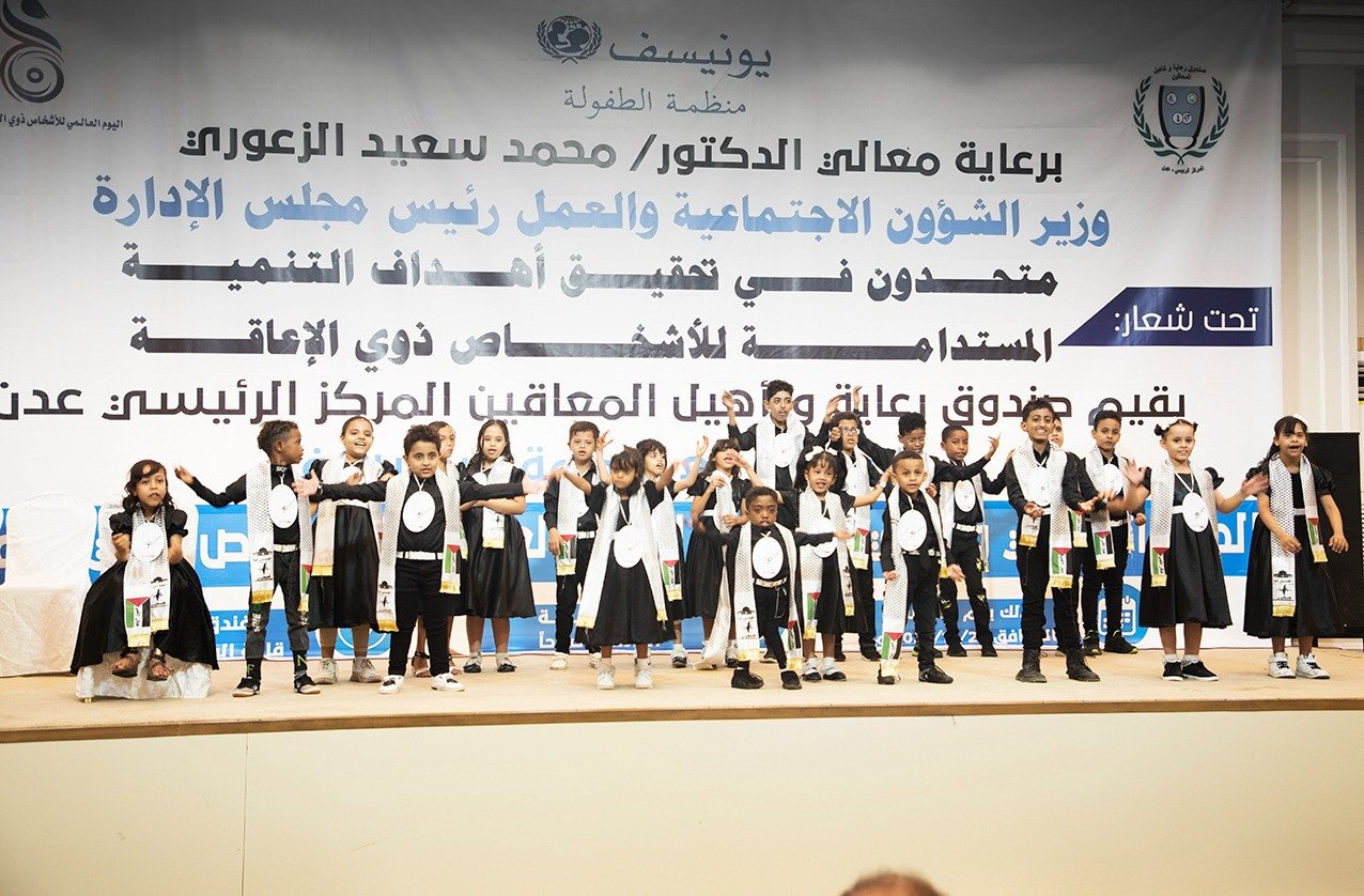 The Fund for the Care and Rehabilitation of the Disabled, its main center in the capital, Aden, on Thursday, organized a speech and artistic ceremony on the occasion of the International Day for People with Disabilities, under the slogan “United in achieving the sustainable development goals for people with disabilities,” under the patronage of Dr. Mohammed Al-Zaouri, Minister of Social Affairs and Labor, and in partnership with UNICEF.