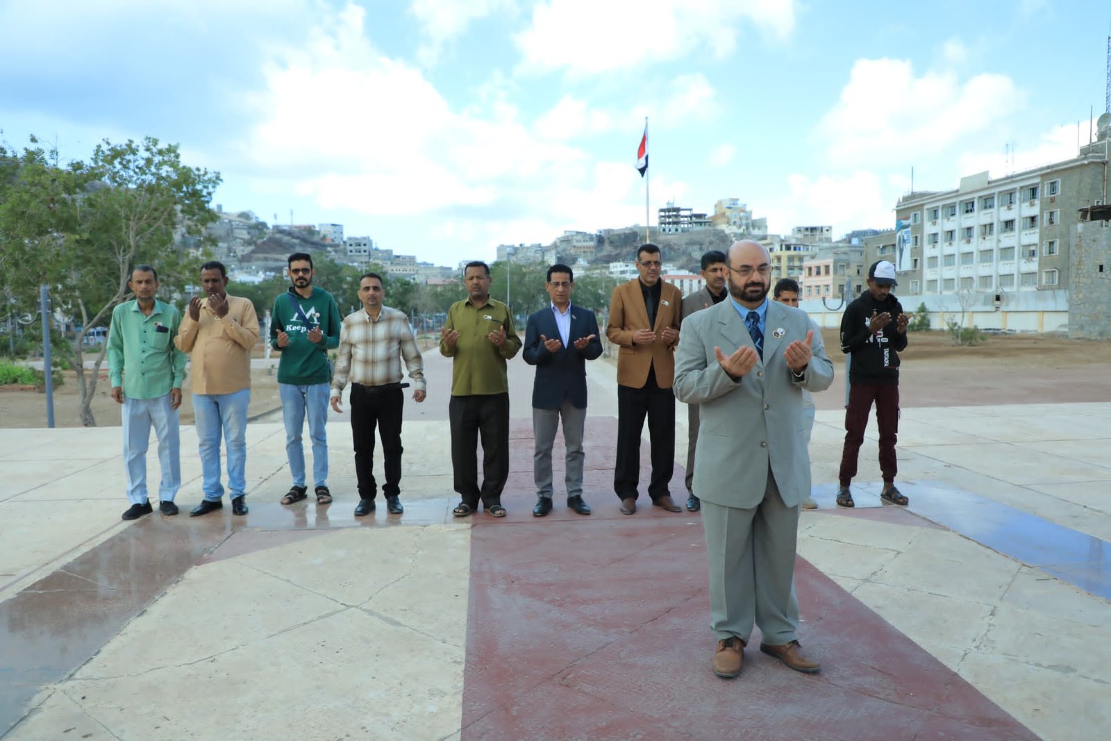 Mr. Abdo Ali Al-Naqeeb, Assistant Secretary-General of the General Secretariat, laid a wreath of flowers in front of the Unknown Soldier Memorial, stood for a minute of silence, and recited Surat Al-Fatihah for the souls of the martyrs of the south, calling on God Almighty to have mercy on them and to make them dwell in heaven with the prophets and the righteous.