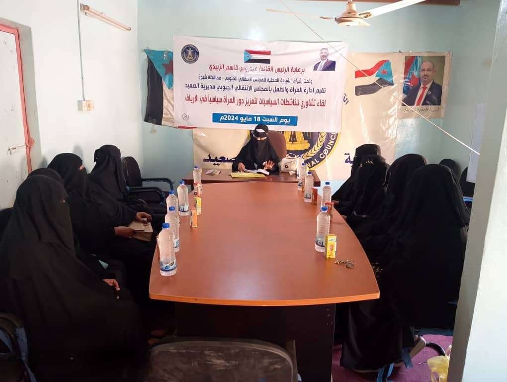 The Women and Child Administration of the Local Leadership Executive Body (LLEB) of the Southern Transitional Council (STC) in the district of As Sa’id, Shabwah Governorate organized today, Saturday, a consultative meeting with a number of female activists in the district to enhance the political role of women in rural areas.