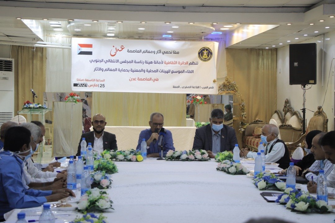 The Cultural Department of the General Secretariat of the Presidency of the Southern Transitional Council (STC), held, on Thursday, in the capital Aden, an extended meeting of the local authorities, public and community corporations, concerned with the protection of monuments in Aden the capital, under the slogan “Together we protect the monuments and antiquities of the capital Aden,” with the participation of Mr. Fadl Al-Jaadi, Deputy Secretary-General of the Presidency The Transitional Council, and Eng. Nizar Haitham, the member of the Presidency of STC, Head of the Executive Authority for the Transitional Council in Aden the Capital.